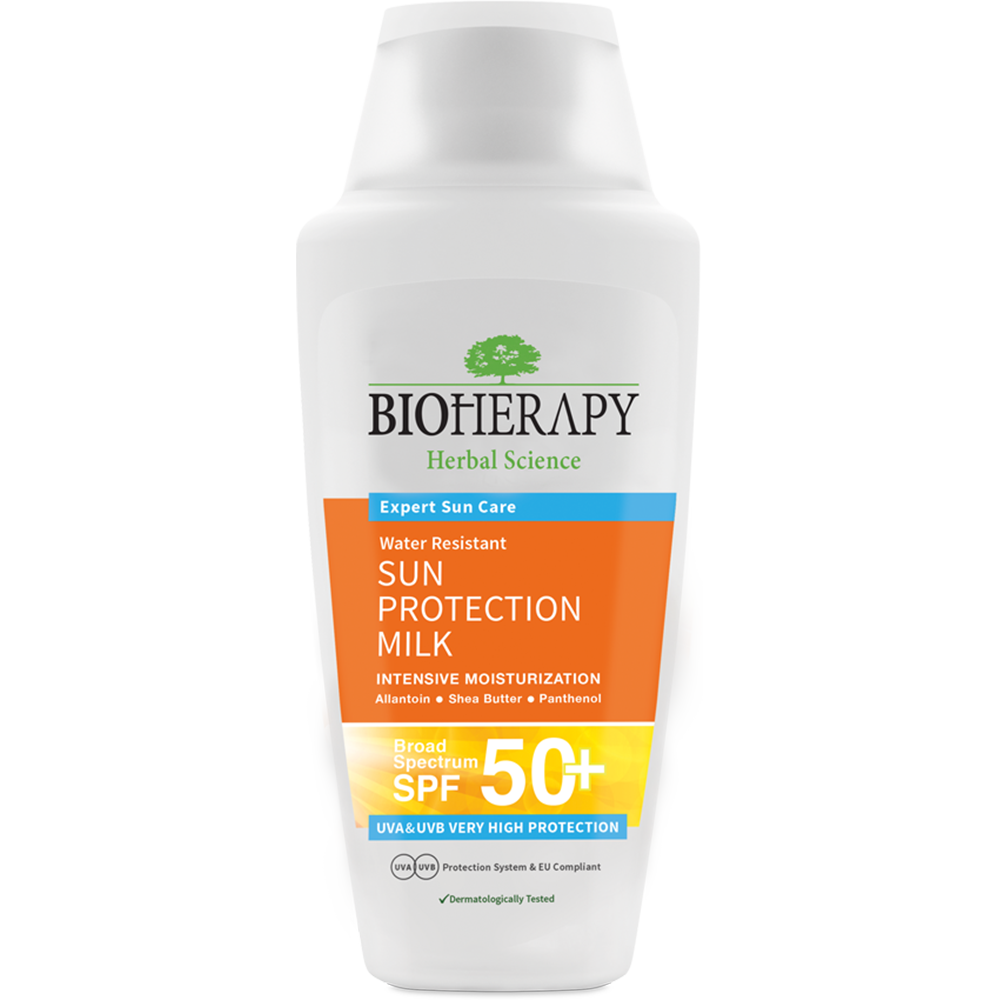 Bloqueador Solar Sun Protection Milk +50 SPF Bioherapy, la fórmula ultraligera contiene filtros foto estables UVA y UVB avanzados, vitaminas y extractos herbales para proteger la piel contra el daño solar, las marcas de pigmentación inducidas por el sol y el envejecimiento prematuro de la piel.